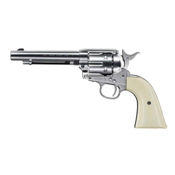 To γνωστό και μη εξαιρετέο Colt Single Action Army είναι διαθέσιμο σε έκδοση με κάννη ραβδωτή και πυροδοτεί μολυβένια βλήματα 4.5χιλ (pellet). Το πλέον πασίγνωστο και από τις ταινίες western! όπου ήταν ο σύντροφος και προστάτης του εκάστοτε cowboy! Πραγματικά εξαιρετική ρέπλικα του αληθινού. Διαθέτει τα γνήσια λογότυπα της Colt (αποκλειστικότητα της Umarex) καθώς και παρόμοιο ρεαλιστικά μηχανισμό αποκλειστικά μονής ενέργειας. Το βάρος του σε συνδυασμό με το ζύγισμά του αλλά και ο τρόπος που τροφοδοτείται τα μολυβένια βλήματα 4.5mm σε νίκελ φυσίγγια με look σφαίρας παραπέμπουν στο ιστορικό Colt. Είναι πλήρως μεταλλικό. Η αμπούλα Co2 κρύβεται πολύ κομψά στη λαβή του.