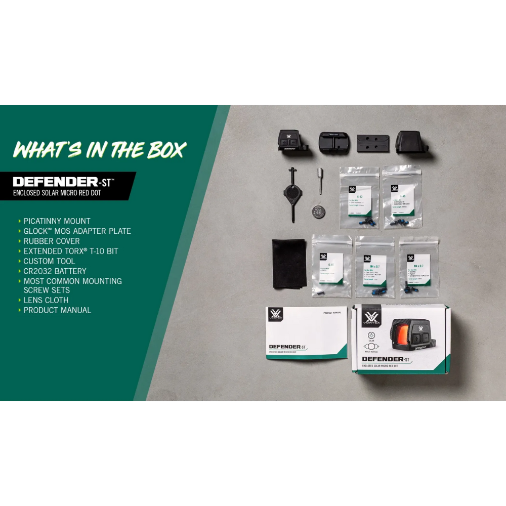 Σκληρό, προσαρμόσιμο, έτοιμο για οτιδήποτε — το Defender‑ST™ Κλειστό Ηλιακό Micro Red Dot σας δίνει πλεονέκτημα χωρίς παραίτηση σε πιστόλια, λειόκανα και τυφέκια. Ο υπερ-ανθεκτικός, πλήρως κλειστός σχεδιασμός του προστατεύει τον εκπεμπτή από κρούσεις και τα καιρικά στοιχεία, κρατώντας σας στο στόχο σε κάθε κατάσταση. Η τροφοδοσία από μπαταρία και ηλιακή ενέργεια το κρατάει ενεργό όσο κι εσείς, ενώ η δυνατότητα πολλαπλών σχήματων σκόπευσης επιτρέπει γρήγορη ρύθμιση και κλειδωμένη στόχευση σε κάθε φωτισμό — μέρα ή νύχτα — σε οποιαδήποτε πλατφόρμα.