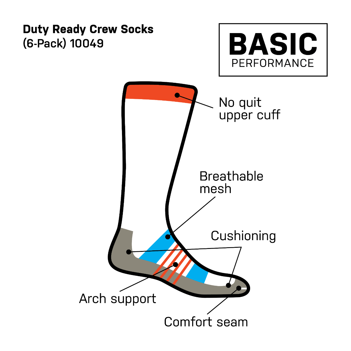 Οι Duty Ready Basic Crew είναι επαγγελματικού επιπέδου βασικές κάλτσες, σχεδιασμένες για άνεση και αντοχή στην καθημερινή χρήση. Με υποστήριξη καμάρας και ενισχυμένο, απορροφητικό πέλμα, προσφέρουν σταθερή και άνετη αίσθηση καθ’ όλη τη διάρκεια της βάρδιας. Το επάνω τελείωμα NO QUIT και η αναπνέουσα πλέξη mesh εξασφαλίζουν σωστή εφαρμογή και δροσερό περιβάλλον για το πόδι. Οι κάλτσες διαθέτουν ιδιότητες απομάκρυνσης υγρασίας και ελέγχου οσμών.
