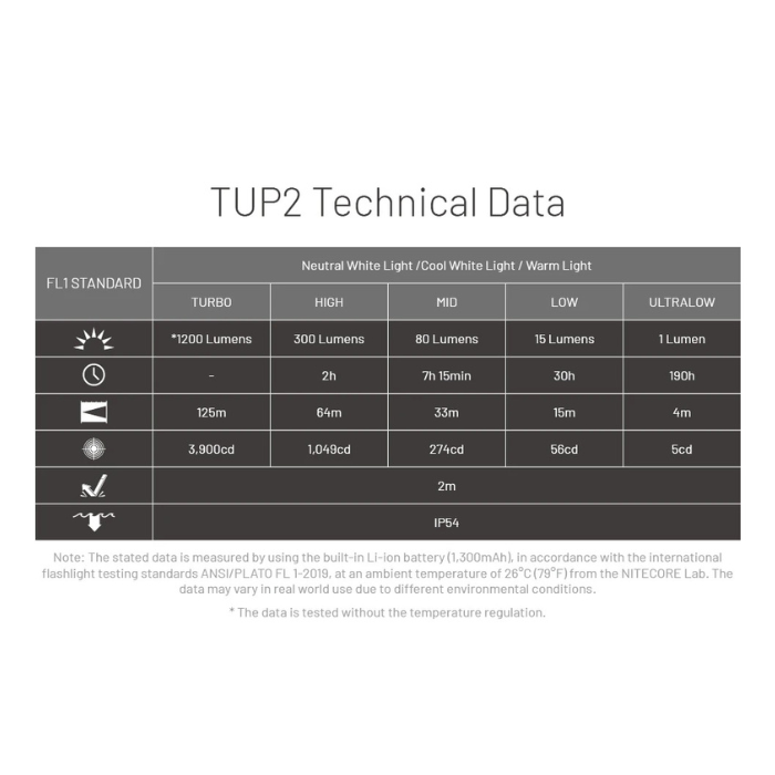 Ο ενσωματωμένος επαναφορτιζόμενος Li-ion 1300mAh εξασφαλίζει έως 190 ώρες λειτουργίας, ενώ οι πολλαπλές θερμοκρασίες χρώματος επιτρέπουν την προσαρμογή σε κάθε περιβάλλον. Με βάρος μόλις 58g και μικρές διαστάσεις, ο Nitecore TUP2 είναι ιδανικό EDC εργαλείο, εύκολο στη μεταφορά και ανθεκτικό για χρήση στο camping, στην ύπαιθρο ή σε καταστάσεις έκτακτης ανάγκης.