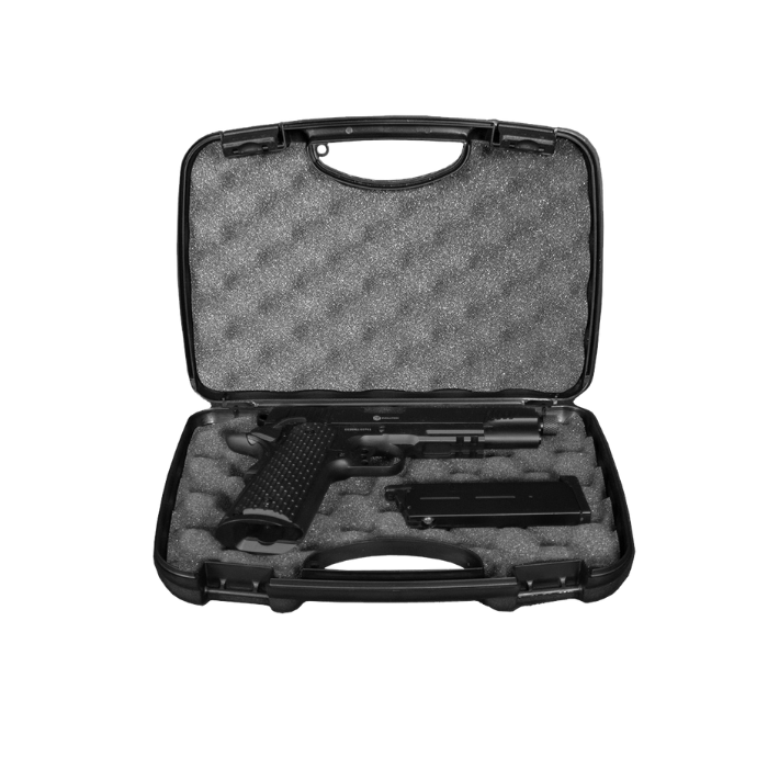 Το πιστόλι συνοδεύεται από πλαστικό βαλιτσάκι μεταφοράς και αποθήκευσης, υψηλής ποιότητας, κατασκευασμένο στην Ιταλία, ιδανικό για προστασία και εύκολη μεταφορά.