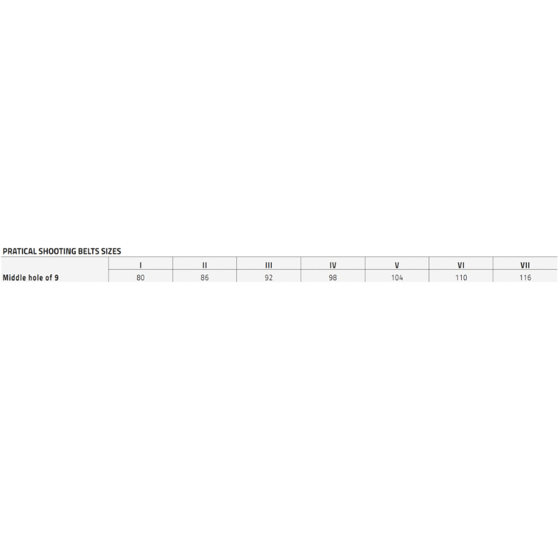 Η ζώνη ακολουθεί το σύστημα PSB (Professional Shooting Belt) και διατίθεται σε μεγέθη: I, II, III, IV, V, VI, VII, VIII.